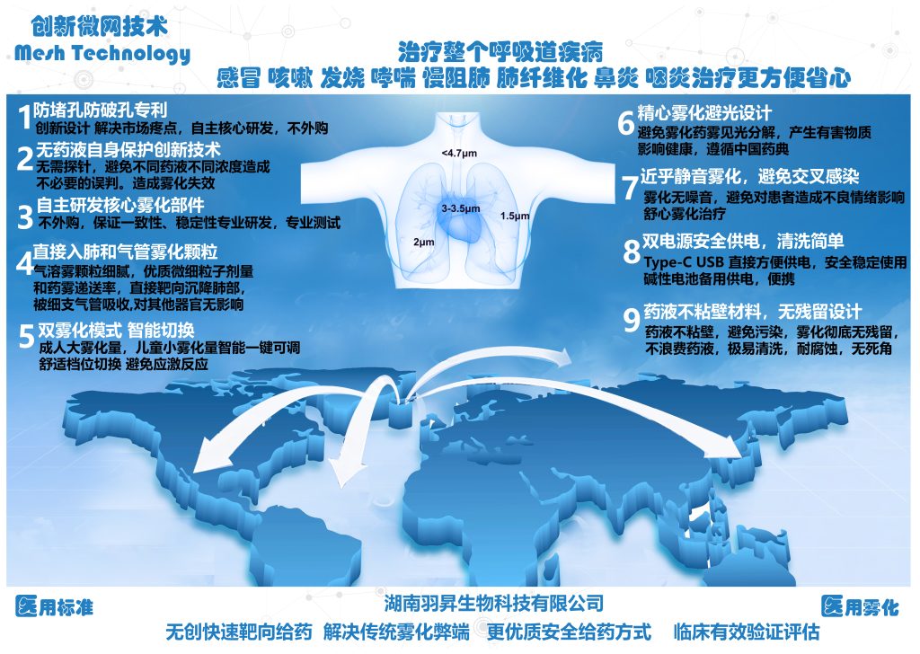 湖南羽昇压电网筛雾化器创新给药方式,操作简单易于维护,适用于医院、门诊、家庭,突破传统压缩雾化局限,中位粒径2.5-3微米气溶雾颗粒无创快速靶向入肺,直达支气管和细支气管,柔和细腻的颗粒给药准确,作用于整个呼吸道,直达病灶。